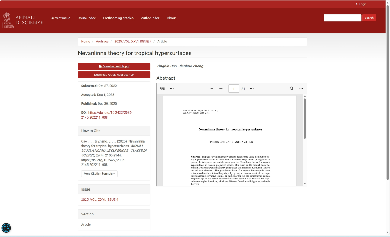 近日,我院数学系曹廷彬教授与清华大学郑建华教授合作完成的论文“Nevanlinna theory for tropical hypersurfaces”在国际著名数学期刊《Annali della Scuola Normale Superiore di Pisa-Classe di Scienze》(比萨高等师范学校科学纪事)正式见刊发表。南昌大学为第一单位。