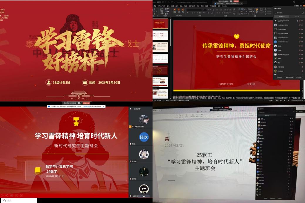 数学与计算机学院研究生各班级于3月集中开展“学习雷锋精神,培育时代新人”主题班会。班会上,各班通过幻灯片宣讲、观看纪录片等形式,组织同学们深入学习雷锋同志的先进事迹,深刻领会雷锋精神“服务人民、助人为乐”的核心实质。